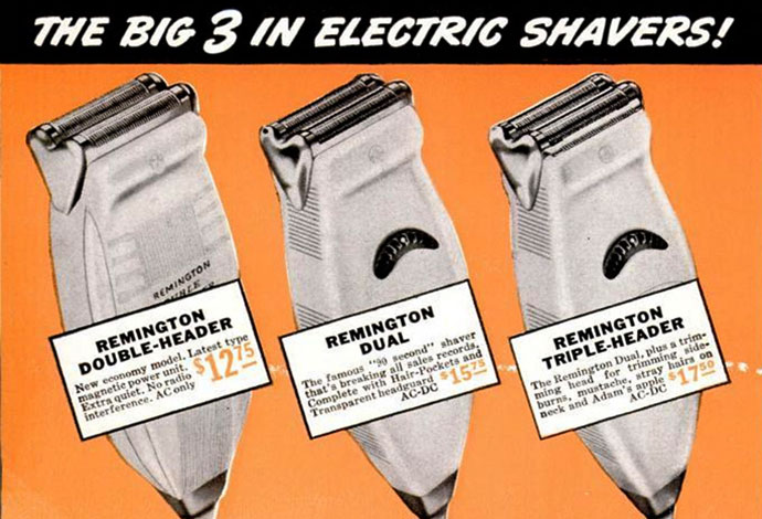 | 1941 | Remington lança a Foursome, a primeira máquina de barbear de várias cabeças com cabeçal de corte.