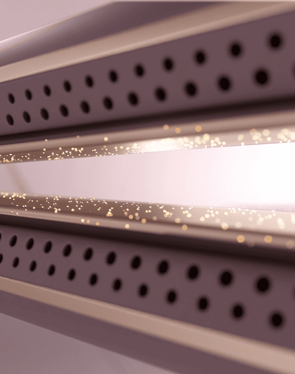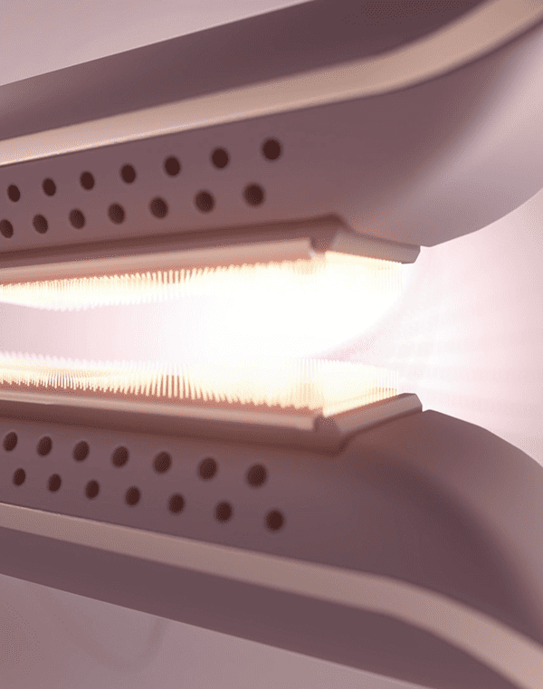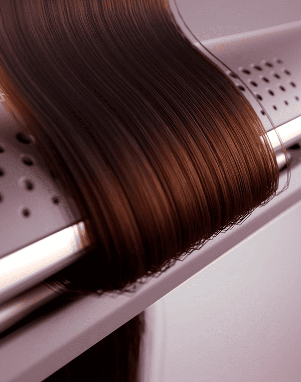 Si puedes escuchar el ventilador, significa que el aire se está distribuyendo a través de las rejillas de salida ubicadas en el borde de las placas alisadoras. La velocidad del flujo de aire es intencionalmente más suave que en el Modo Húmedo para enfriar tu cabello sin alterar la superficie suave de los mechones recién peinados.