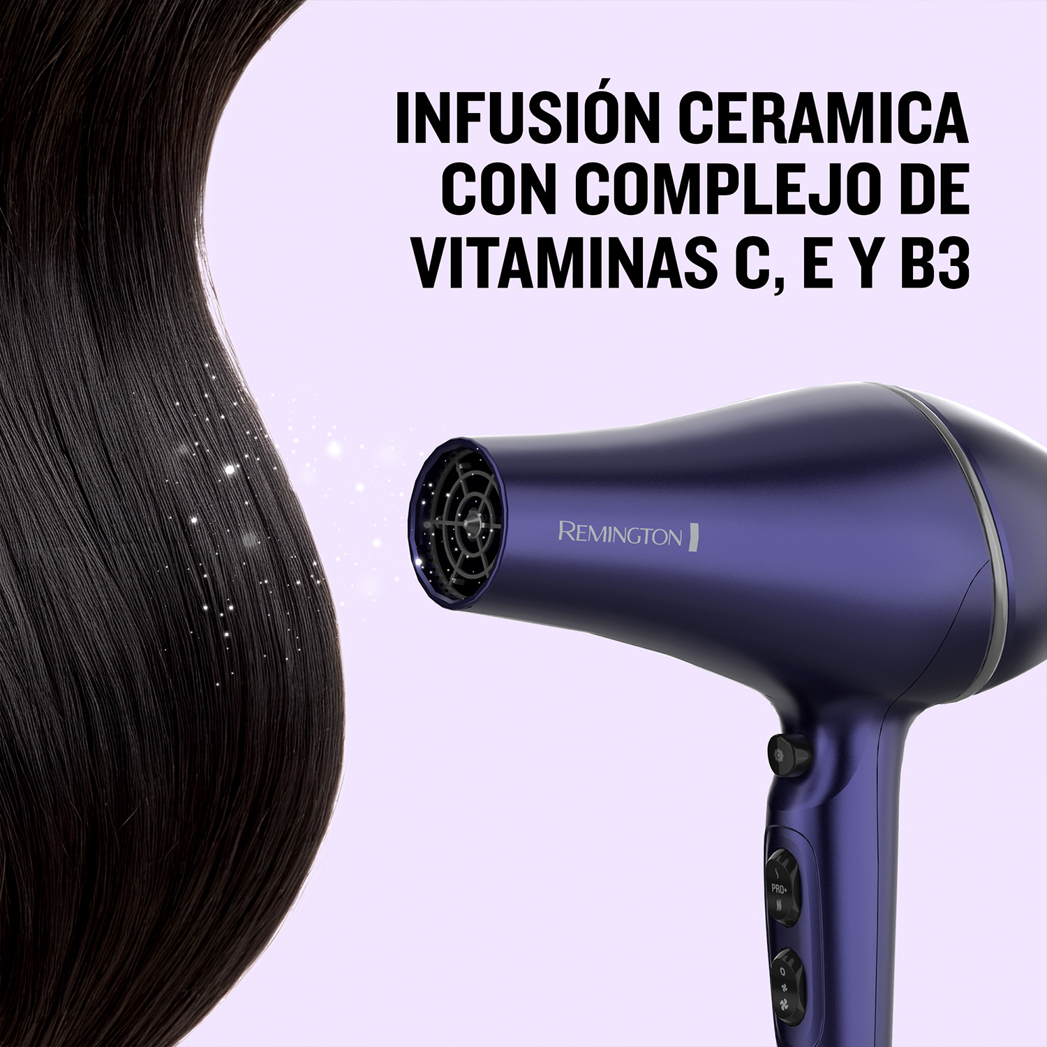 El secador cuenta con tres Tecnologías para Realzar el Brillo para una suavidad y brillo instantáneos. La rejilla de cerámica está enriquecida con microacondicionadores, como vitaminas C, E y B3, que se liberan en el cabello al secarlo. El acondicionamiento iónico proporciona un 90 % más de iones para combatir el encrespamiento y lograr un cabello suave y brillante. Finalmente, el diseño especializado del concentrador reduce los puntos calientes, garantizando una distribución uniforme del calor mientras peinas.