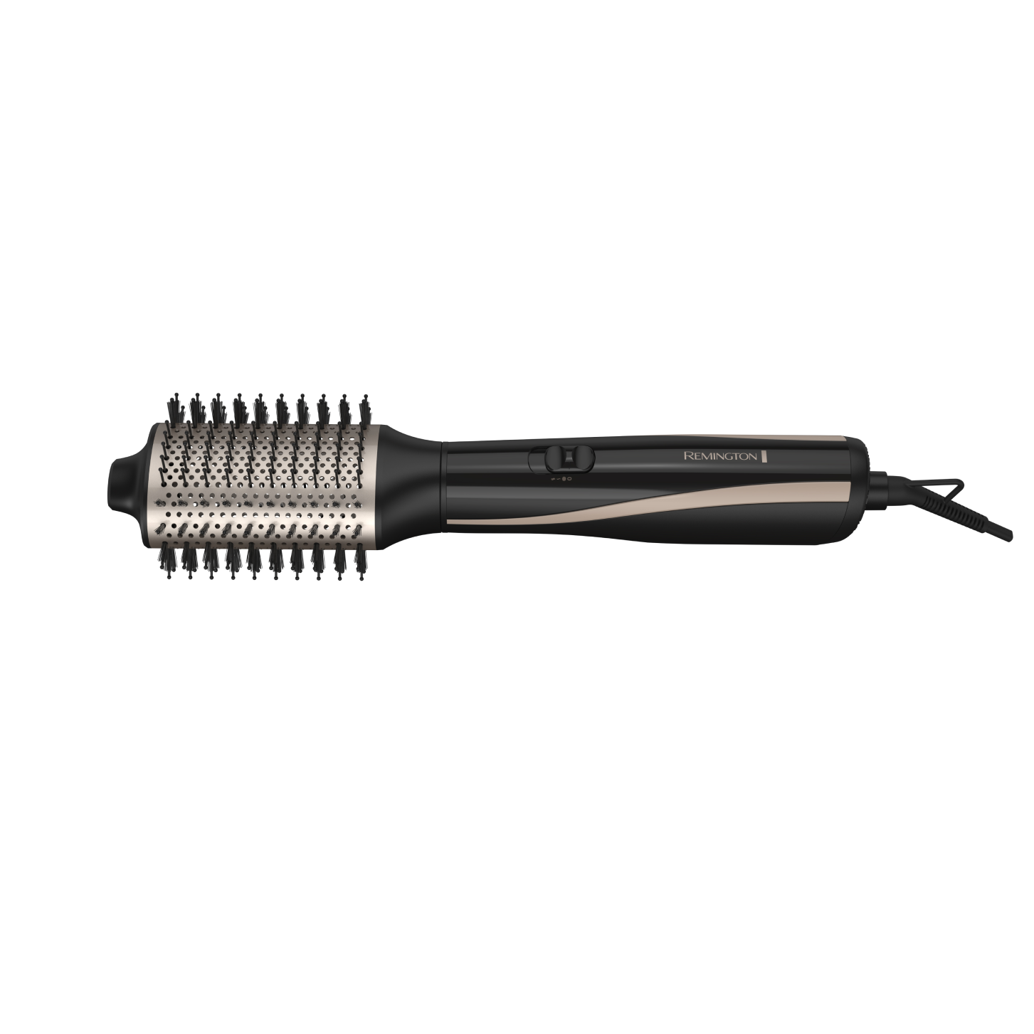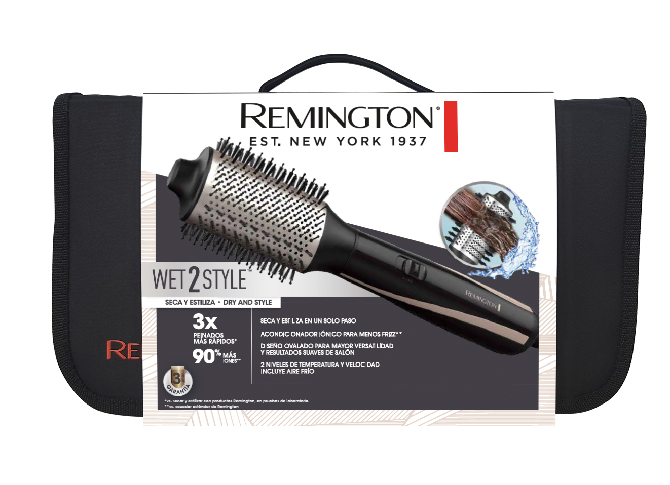 ¡Disfruta más tu tiempo! Seca y estiliza tu cabello en un solo paso. El cepillo de aire caliente Remington® Wet2Style™ cuenta con un exclusivo cilindro ventilado que utiliza un potente flujo de aire y un calor optimizado para eliminar el exceso de agua a medida que te peinas. Esto elimina la necesidad de secar el cabello con secador, por lo que puedes peinarte hasta un 3 veces más rápido*. El diseño ovalado con cerdas mixtas es ideal para suavizar estilos y crear volumen en las raíces. Además, su tecnología de acondicionamiento iónico genera 90% más iones**, para un secado libre de frizz. Para que disfrutes de un rendimiento óptimo para tu tipo de cabello, el cepillo de aire cuenta con controles separados para la temperatura, la velocidad y ráfaga de aire frío para fijar tu estilo. ¡Los peinados en casa nunca han sido tan fáciles!