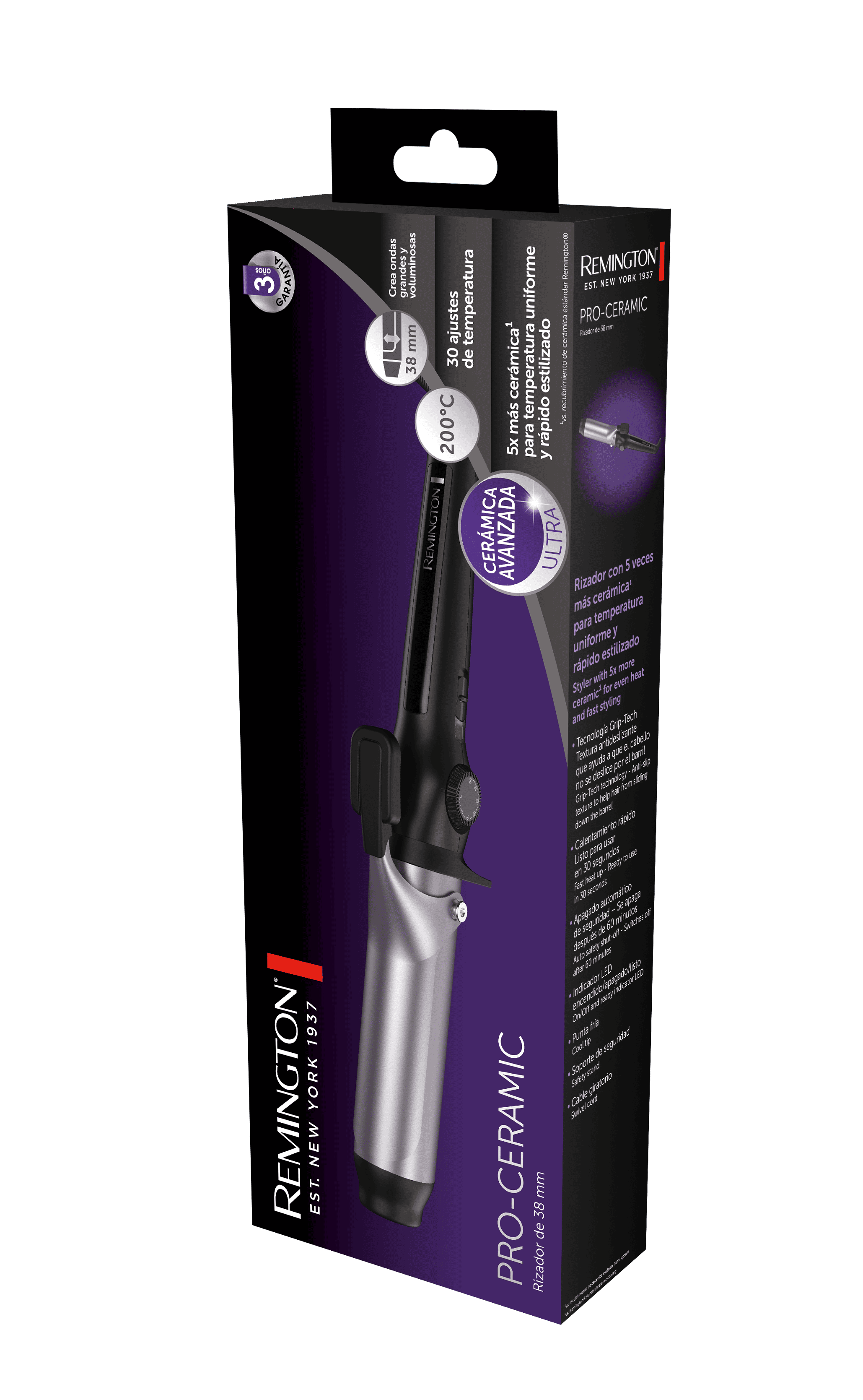 Descubre el rizador Pro-Ceramic de Remington! Su barril de cerámica Ultra y 38 mm, con 5 veces más cerámica*, ofrece una temperatura uniforme para rizos grandes y voluminosos. Con 30 niveles de temperatura hasta 200 °C, logra resultados rápidos, duraderos y hermosos.