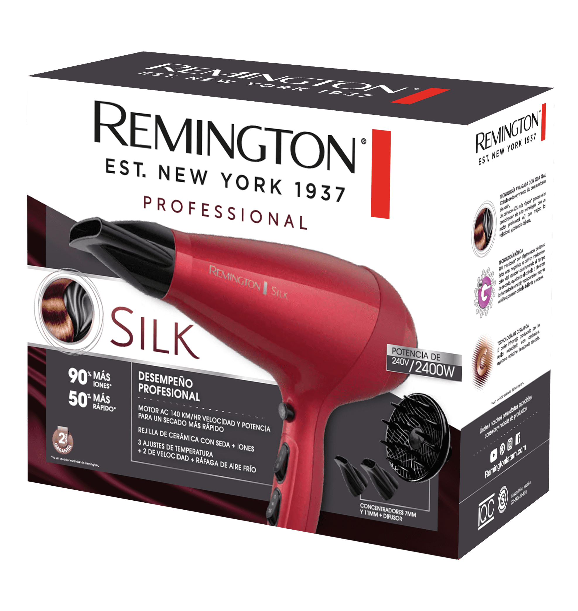 Deja tu cabello suave y terso con Remington. El secador de cabello profesional con tecnología avanzada SILK Ceramic funciona hasta 50% más rápido* gracias al motor de 2400w. El revestimiento de cerámica avanzada en la rejilla del secador genera un 90% más de iones* para darle un acabado suave y sedoso libre de frizz. Además, incluye dos cabezales de fijación: un concentrador para un estilo de precisión y un difusor para mantener los rizos y la textura.