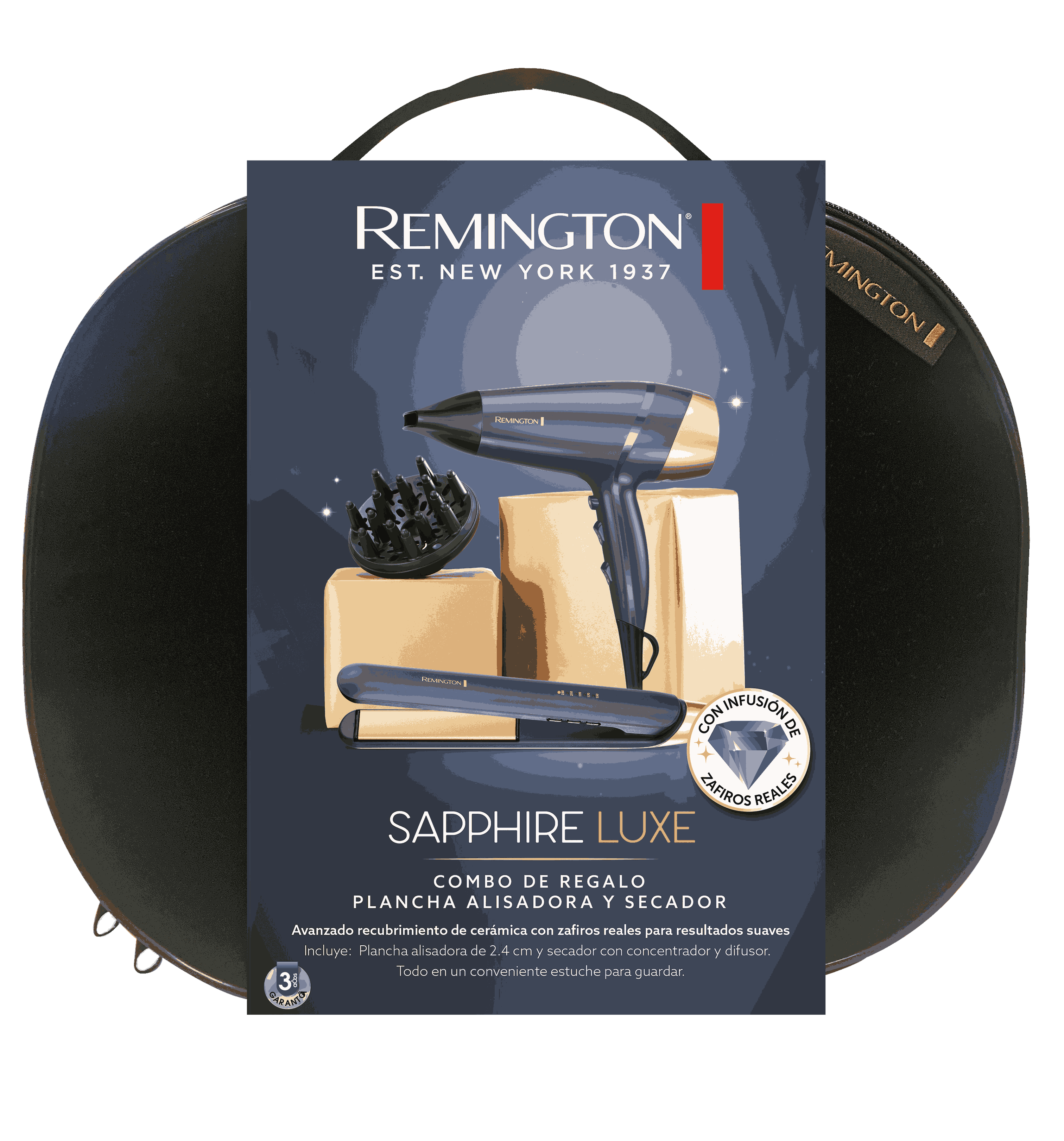 ¡Déjate sorprender por el increíble combo Sapphire Luxe! Combinando tecnología de vanguardia y elegancia, este combo de plancha alisadora y secador te brindará resultados espectaculares. Gracias a su innovador recubrimiento cerámico con infusión de zafiros reales, tu cabello lucirá más suave, brillante y libre de frizz. Además, incluye un práctico estuche que te permitirá llevarlo contigo a donde vayas, ¡para que siempre luzcas impecable!